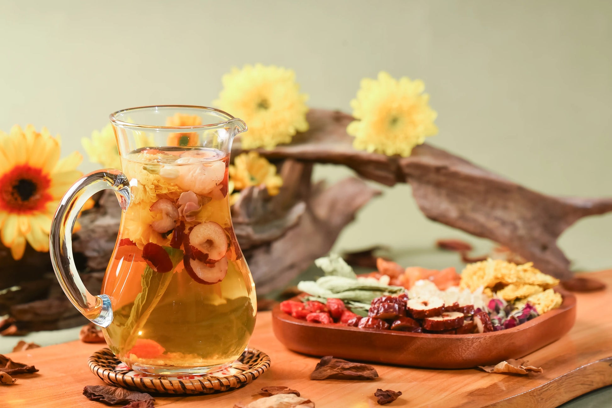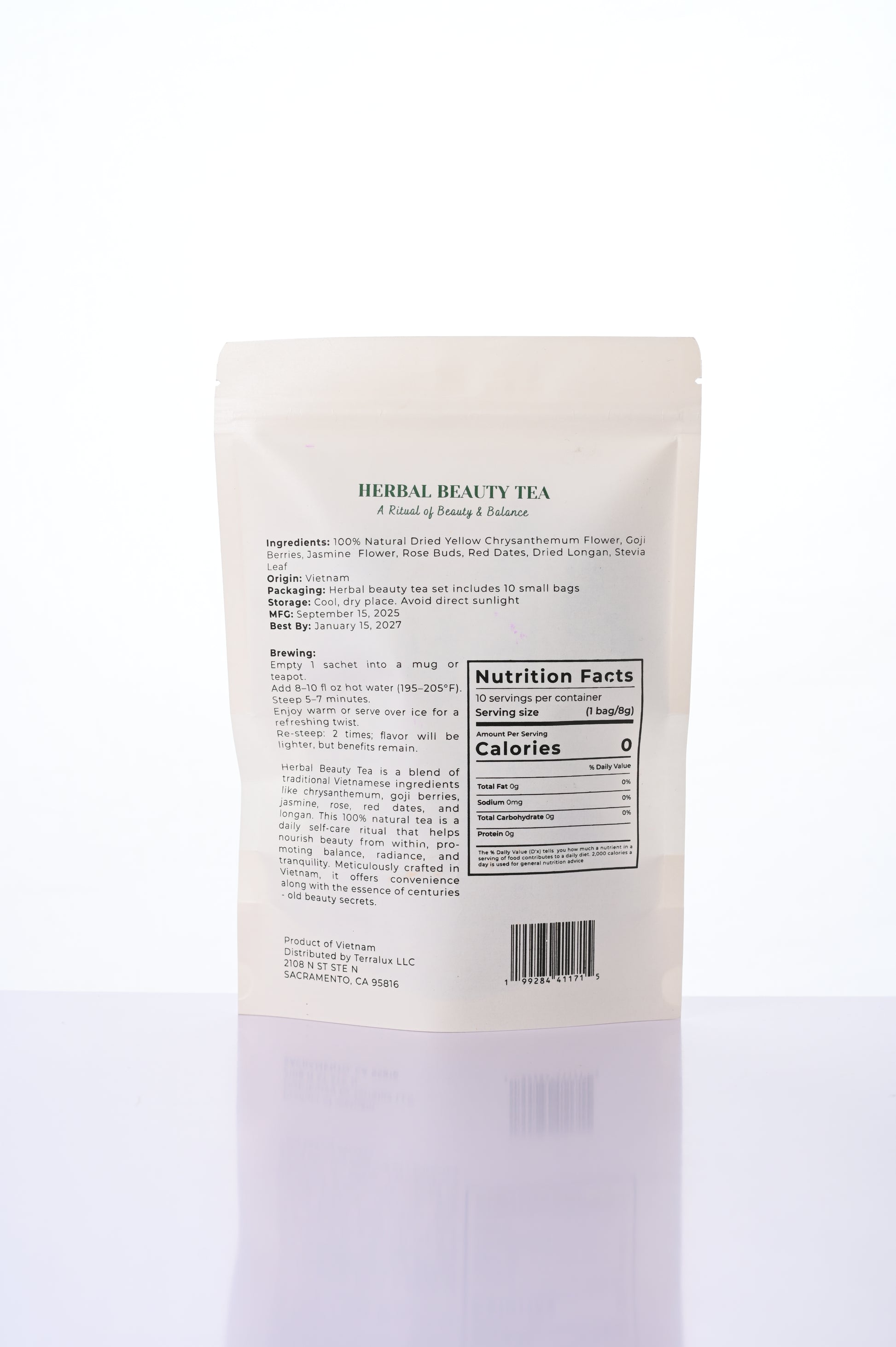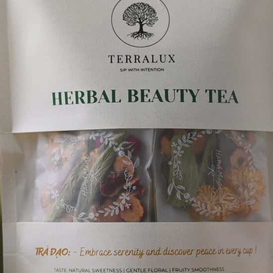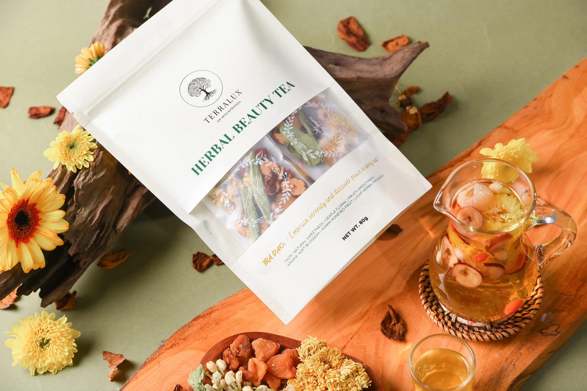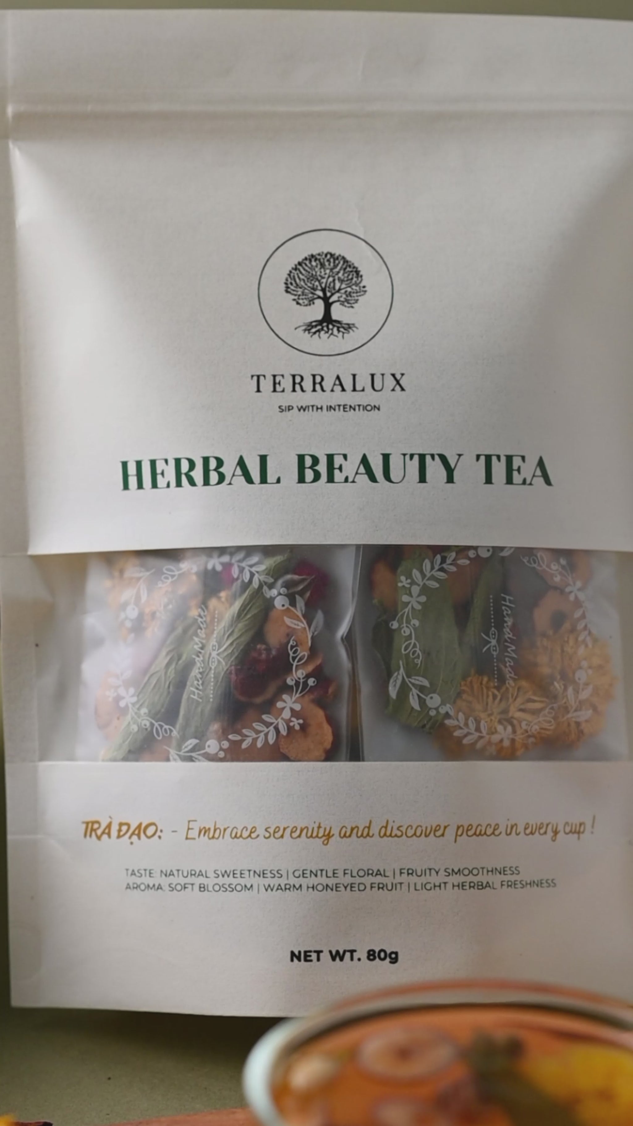 A delicate blend of golden chrysanthemum, goji berries, jasmine, rose buds, red dates, longan, and sweet grass — crafted to nourish from within and enhance natural radiance. Rooted in Vietnamese wellness traditions, each cup offers a soothing floral sweetness and a moment of tranquility.